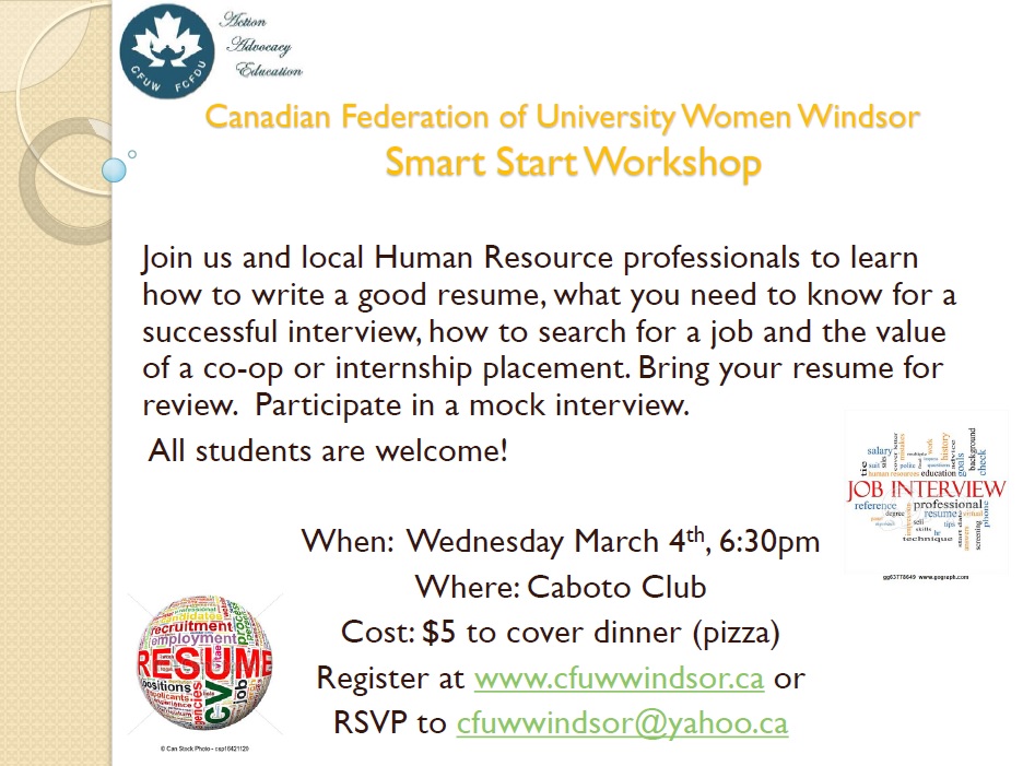 Windsor, ON – The Canadian Federation of University Women (CFUW) Windsor will be holding a Start Smart Workshop to assist in preparing Windsor-Essex students to enter the job market. This event will be held at the Caboto Club on March 4th at 6:30pm. The event will cost $5 per attendee to assist in covering the cost of a light meal including pizza. Continue reading