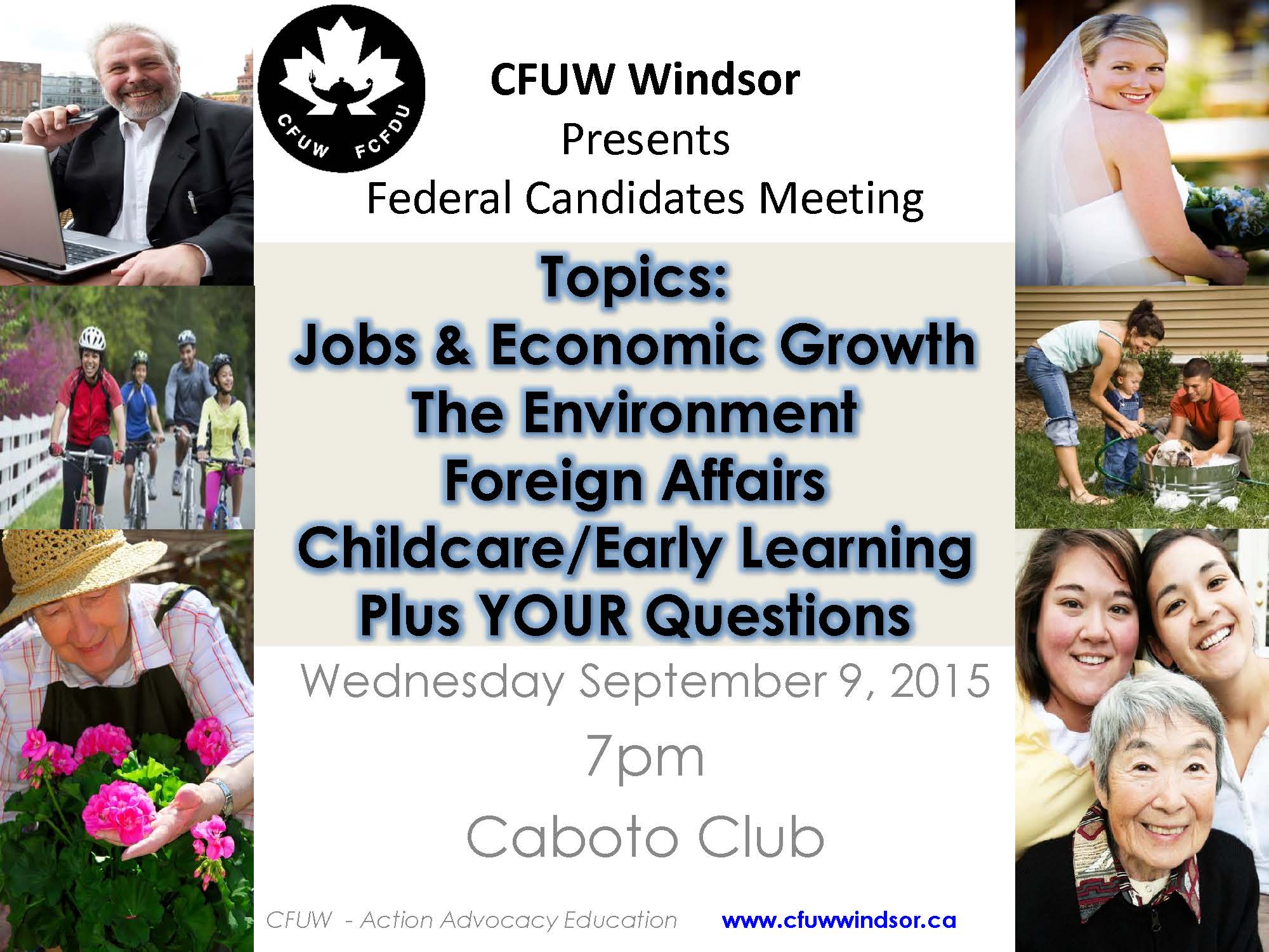 The Canadian Federation of University Women (CFUW) Windsor will be presenting a Candidates Meeting in advance of the Federal Election on Wednesday September 9th from 7pm to 9pm at the Caboto Club, 2175 Parent Ave. in Windsor. The meeting will focus on four (4) main topics: Jobs and Economic Growth, The Environment, Foreign Affairs, and Childcare/Early Learning. The panel will be moderated by CTV Windsor’s Christie Bezaire and will have representation from the Green Party (David Momotiuk), the Liberal Party (Frank Schiller), and the NDP (Tracie Ramsey). At this time, The Conservative Party has not agreed to participate. Continue reading