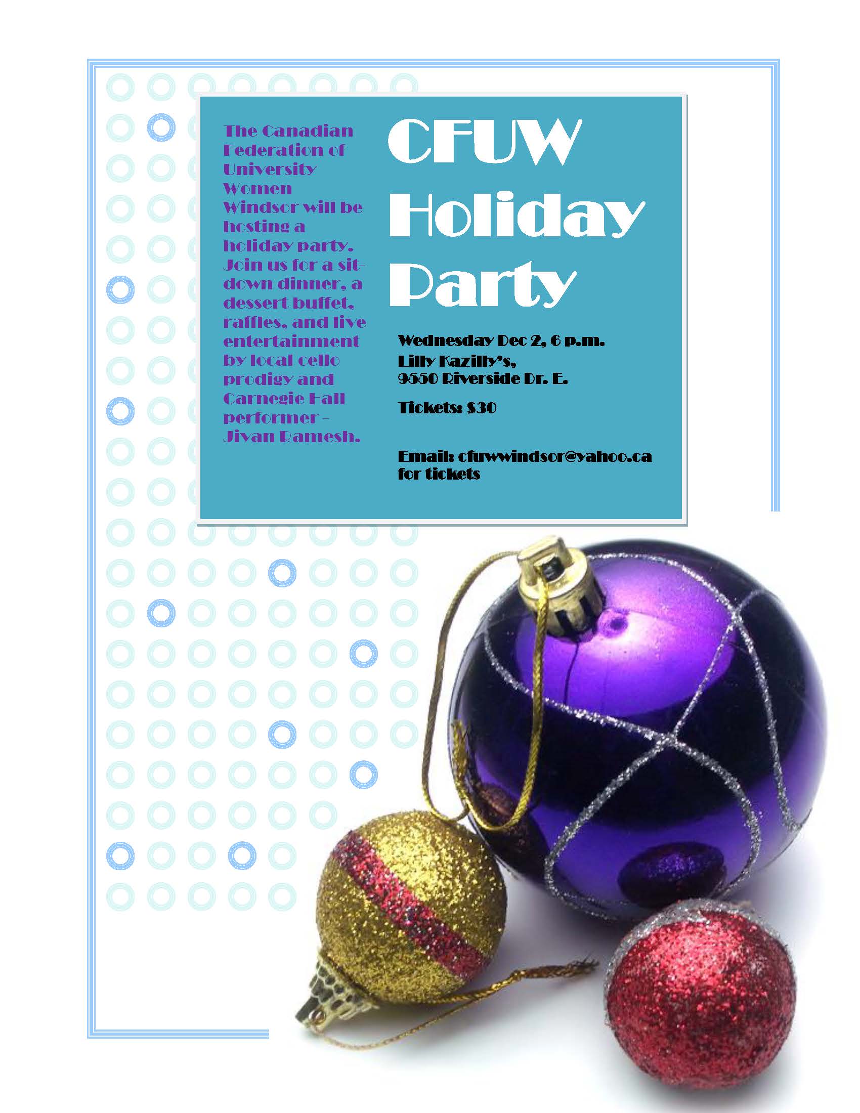 The Canadian Federation of University Women Windsor will be hosting a holiday party.
